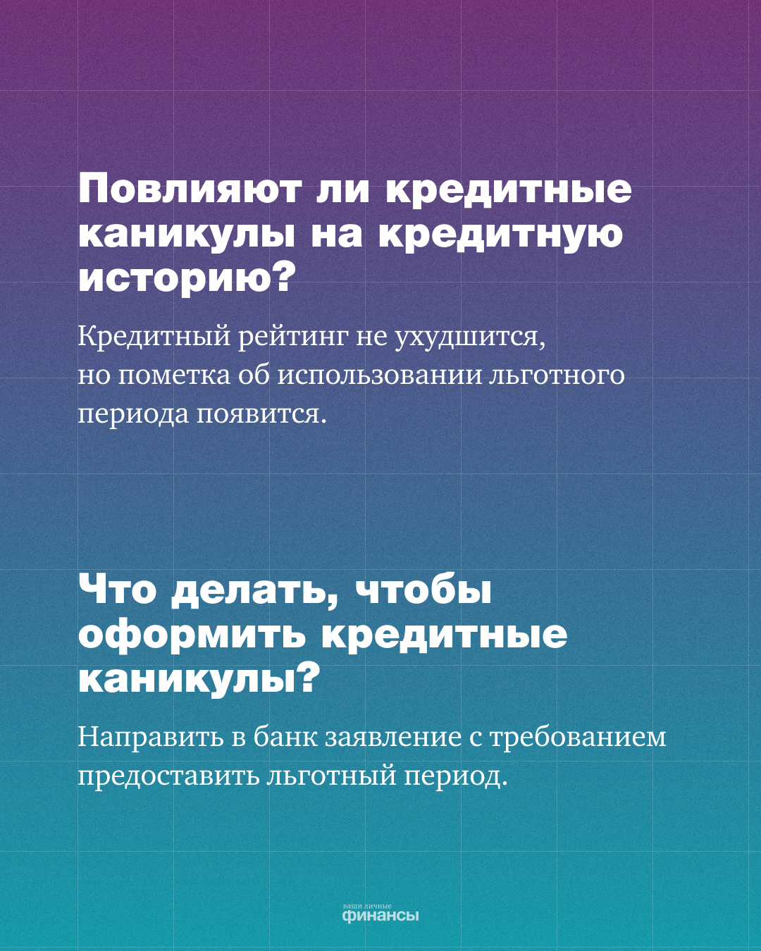 Кредитные каникулы дают возможность воспользоваться льготным периодом до полугода и получить отсрочки платежей по ипотеке, потребительским и автокредитам, а также по кредитным картам. Как воспользоваться кредитными каникулами — собрали ответы на популярные вопросы.