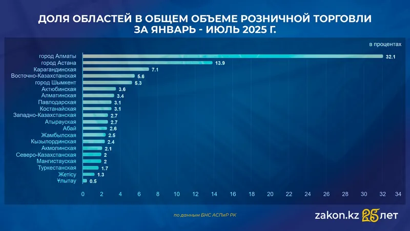 Наибольший объем (3,2 трлн тенге) торговли приходится на Алматы – мегаполис занимает треть рынка!