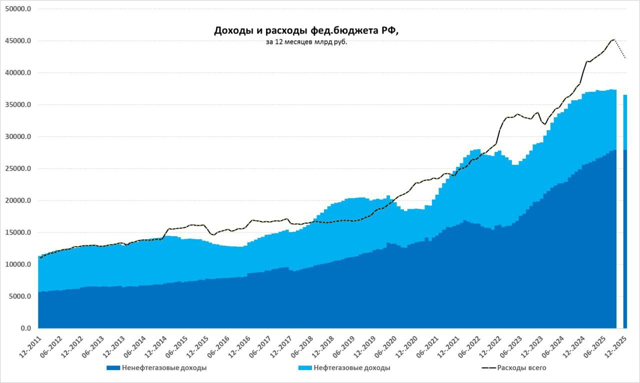 За последние 12 месяцев доходы бюджета ₽37.4 трлн (новый план ₽37.1 трлн), расходы растут быстрее и составили ₽45.2 трлн (план ₽42.8 трлн), но в этих расходах есть авансы, если их убрать траектория расходов идет в район ожидаемых ₽43 трлн. Накопленный за 12 месяцев дефицит расширился до ₽7.8 трлн (новый план ₽5.7 трлн). Я пока все же ждал бы общего дефицита чуть больше плана.