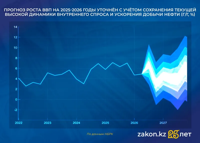 В докладе НБРК «Доклад о денежно-кредитной политике. Ноябрь 2025» прогноз замедления роста ВВП связан с влиянием высокой базы 2025 года, когда экономика, по оценкам Нацбанка, вырастет на 6-6,5%. Кроме того, сдерживать рост в 2026 году будут меры фискальной консолидации, включая планируемое повышение ставки НДС, и высокие объемы импорта.