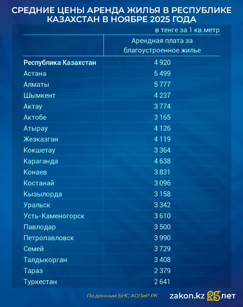 По состоянию на ноябрь 2025 года средняя цена аренды благоустроенного жилья по стране достигла 4 920 тенге за квадратный метр. Годовой рост составил 11,9%, а динамика с декабря 2020 года равна 106,8%.
