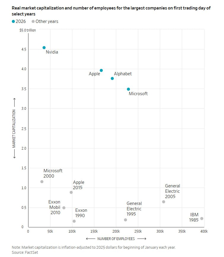 Резкий рост прибыли и акций направляет всё большую часть ВВП компаниям, их ведущим сотрудникам и акционерам. Искусственный интеллект усилит эту тенденцию. В 1985 году IBM была самой ценной компанией Америки, одной из самых прибыльных и одним из крупнейших работодателей с численностью персонала почти 400 000 человек. Сегодня Nvidia почти в 20 раз ценнее и в 5 раз прибыльнее, чем IBM в то время, с поправкой на инфляцию. При этом в ней работает примерно в 10 раз меньше людей.