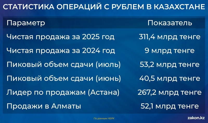 Больше всего рублей сдали жители Астаны – на 267,2 млрд тенге больше, чем купили. В Алматы разница составила 52,1 млрд тенге.
