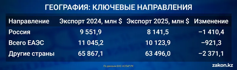 В 2024 году Казахстан экспортировал товаров на 81 674,1 млн долларов. В 2025 году этот показатель сократился до 79 041,2 млн. Потери составили 2 632,9 млн долларов, или 3,2% в годовом выражении.