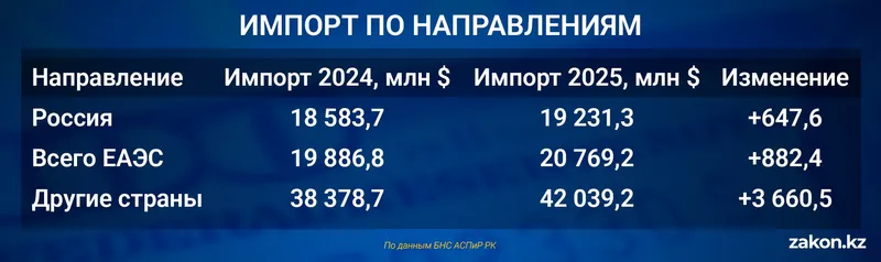 На фоне снижения экспортной выручки импорт продемонстрировал противоположную динамику. В 2025 году Казахстан закупил товаров на 64 847,0 млн долларов против 60 398,0 млн годом ранее. Прирост составил 4 449,0 млн долларов, или 7,4%.