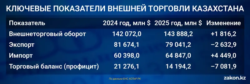 В целом итоги 2025 года нельзя трактовать как кризис внешней торговли Казахстана. Внешнеторговый оборот остается на исторически высоком уровне, а торговый баланс сохраняет положительное значение.
