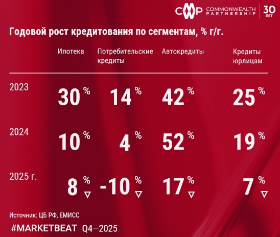 Отложенный эффект от проведения жесткой денежно-кредитной политики привел к снижению инфляционного давления до уровня середины 2023 г. На протяжении 2-4 кварталов инфляция была существенно ниже показателей предыдущих лет. В результате в 4-м квартале 2025 года совет директоров Банка России продолжил цикл снижения ключевой ставки двумя символическими снижениями на 50 б. п.: с 17% годовых в начале квартала до 16% годовых на 19 декабря.