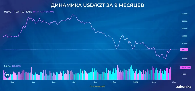 К 10 октября курс опустился ниже 540, к 31 октября – ниже 530, в середине ноября преодолел 520. К 4 февраля 2026 года доллар стоил уже менее 500 тенге.