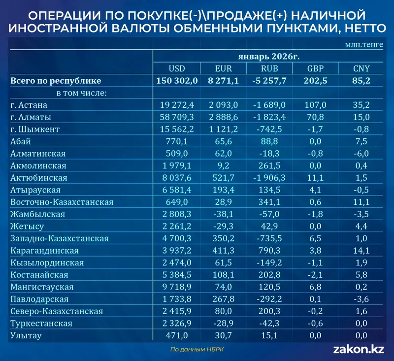 В целом январская картина подтверждает устойчивую структуру наличного валютного рынка: основной спрос сосредоточен на долларе, евро занимает второе место с большим отрывом, а рубль в начале года чаще продавали. Ключевую роль в формировании общенациональных показателей продолжают играть Алматы и Астана.