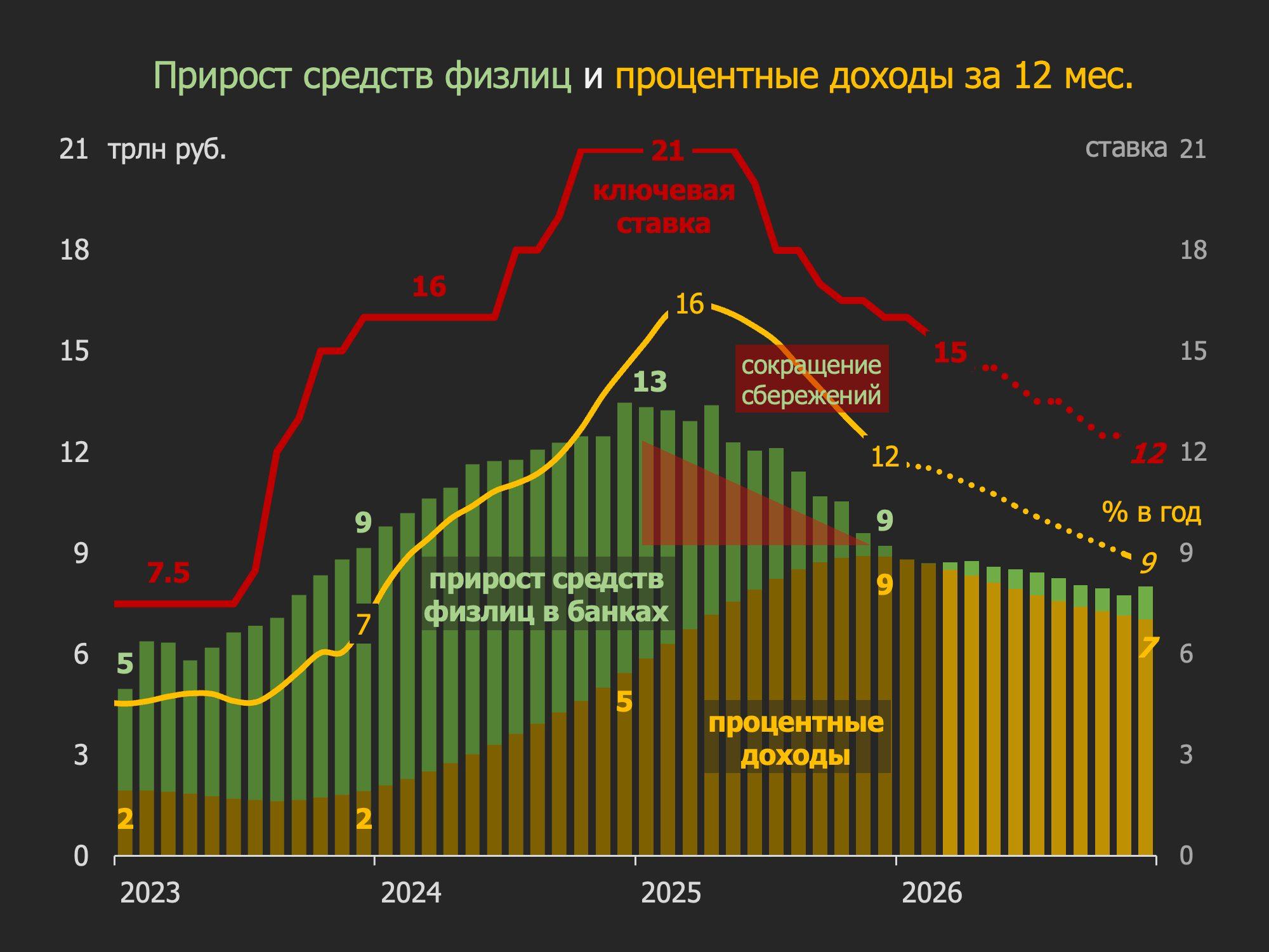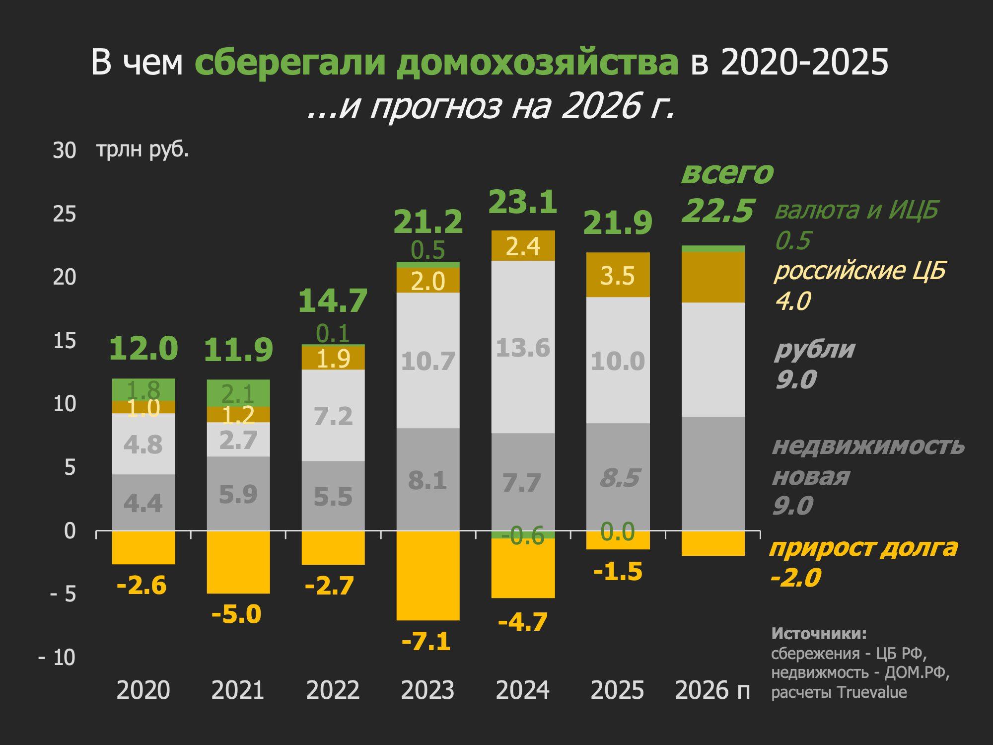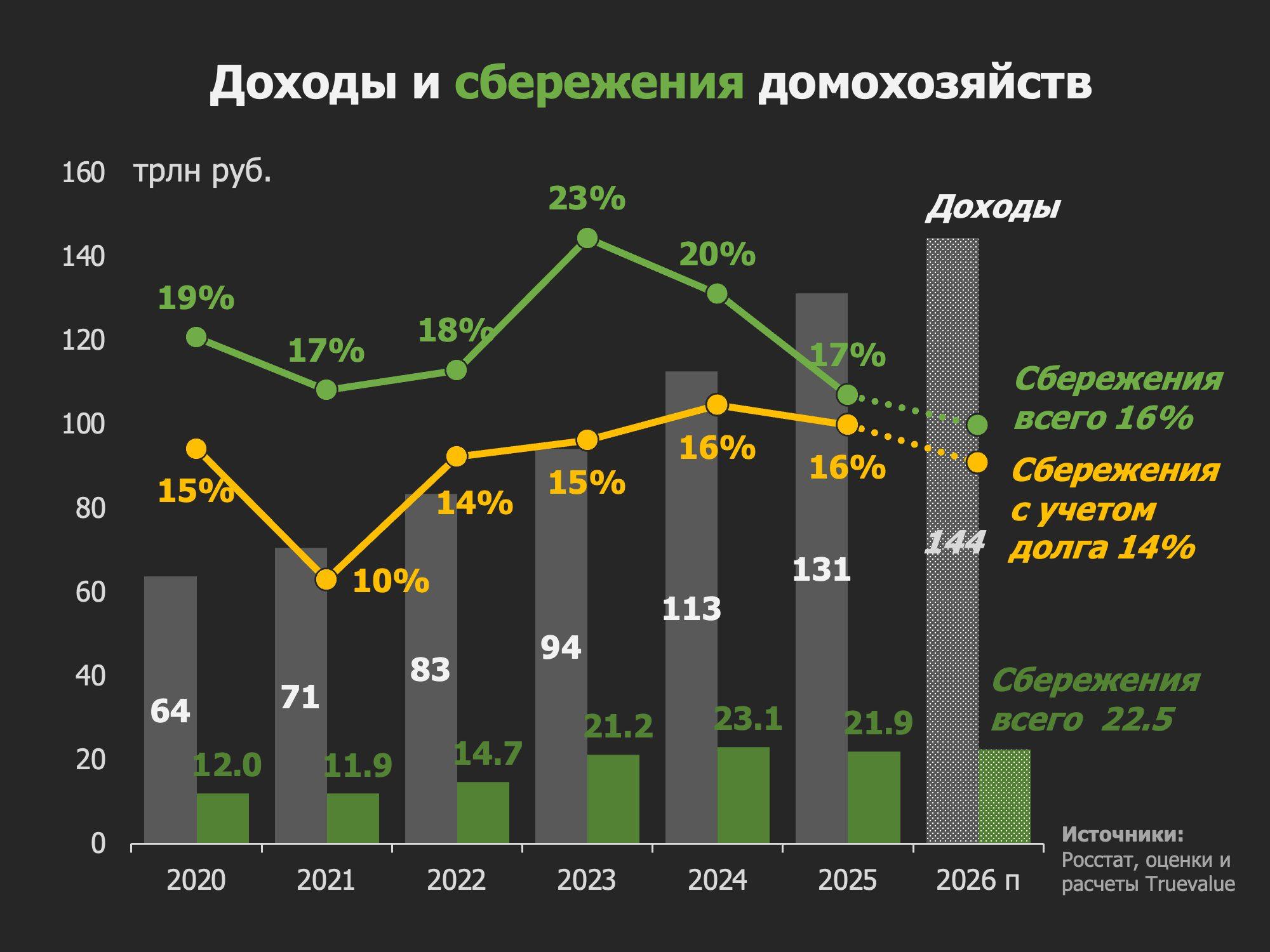 1. Сбережения домохозяйств без учета долга находятся на одном уровне 21-23 трлн руб. три года, но значимо снижаются относительно доходов с макс. 23% в 2023 до минимума 17% в 2025 г. В 2026 может быть ниже 16%.