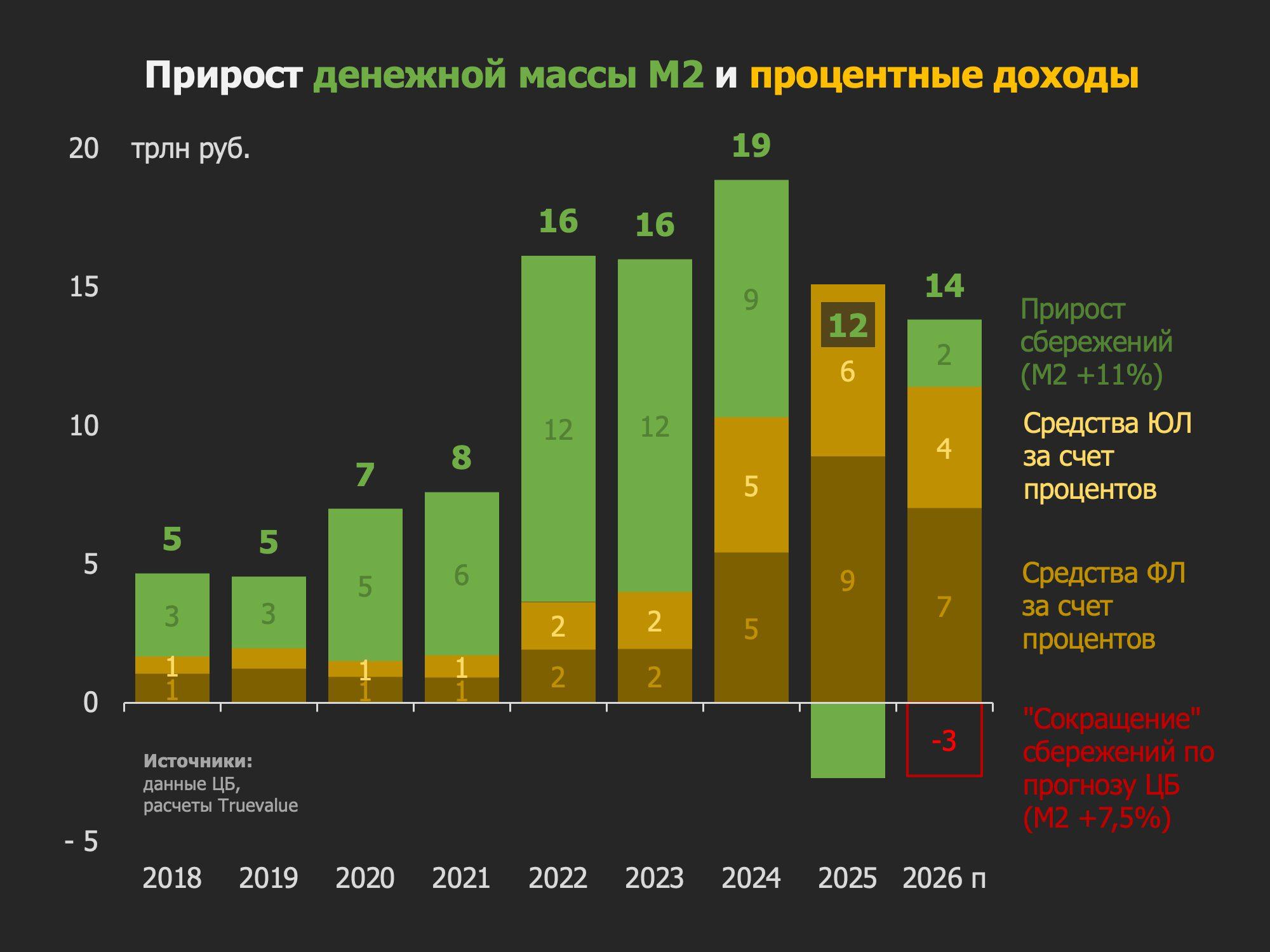 4. Прогноз Банка России по М2 (средняя 7,5% из 5-10% в 2026) снова предполагает сокращение сбережений на уровне М2 за вычетом процентных доходов. В основном это касается юрлиц. В 2025 они потратили почти все процентные доходы (4 из 6 трлн). В 2026, видимо, также должны быть в минусе, кроме тех, кто сидит на депозитах и мало инвестирует (привет отдельным компаниям на фондовом рынке!). Физлица из непроцентных доходов сберегли лишь 1 трлн в 2025 против 6-9 в 2022-2023 гг. при более низкой КС (10% против 19%). В 2024 на разгоне КС и физлица, и юрлица как активно брали кредиты, особенно льготные, так и сберегали.