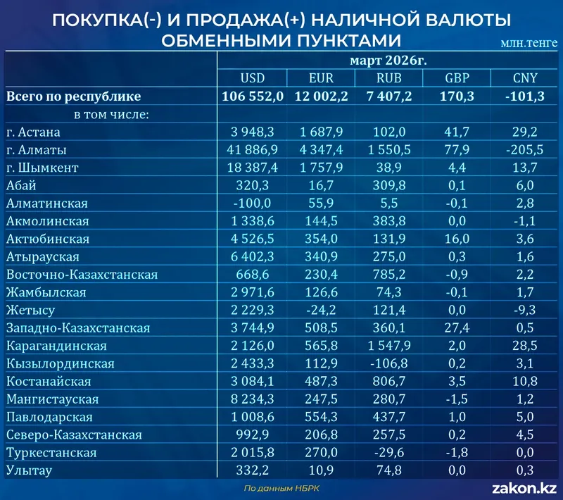 Самый показательный тренд зафиксирован в операциях с американской валютой. По данным Нацбанка Казахстана, в марте 2026 года объем нетто-продаж (разница между покупкой и продажей валюты населением) составил 106 552 млн тенге. Это ровно в три раза меньше декабрьского показателя, когда на фоне предновогодней суеты и ожиданий казахстанцы продали долларов на 322 758 млн тенге.